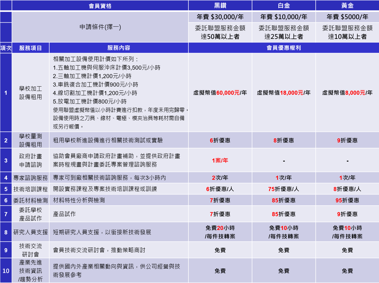 會員優惠服務 將依據您與本聯盟簽訂契約之年費額度,給予不同分級優惠權利。會員別級分級如下:(1)黑鑽會員:每年會費為新台幣3萬元整,或年度委託聯盟服務金額達50萬以上者。(2)白金會員:每年會費為新台幣1萬元整,或年度委託聯盟服務金額達25萬以上者。(3)黃金會員:每年會費為新台幣5,000元整,或年度委託聯盟服務金額達10萬以上者。